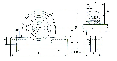 说明:此为带座外球面球轴承最典型最常见的一种型式,适用于所有的传动装置和轴与安装面平行的机械上。